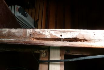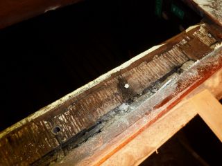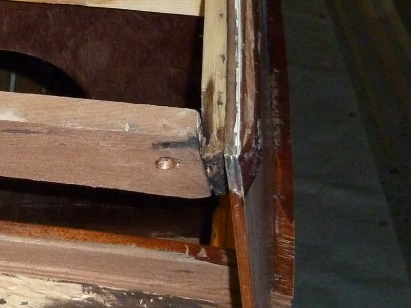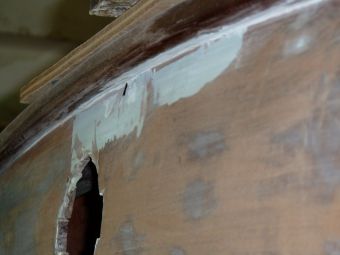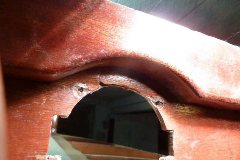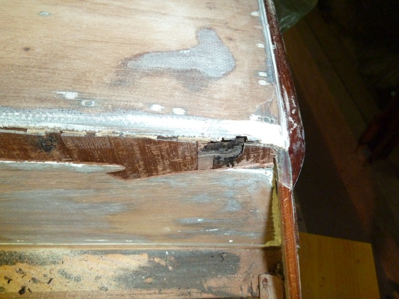 Une tentative de creuser le contre-plaqué pour retirer le pourri et couler de l'epoxy entre les deux plis sera vouée à l'échec, la paroi restante est trop fine et l'hiloire est attaquée d'un peu partout. Allez on la vire aussi !