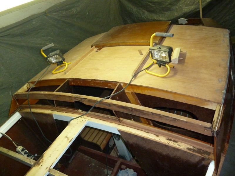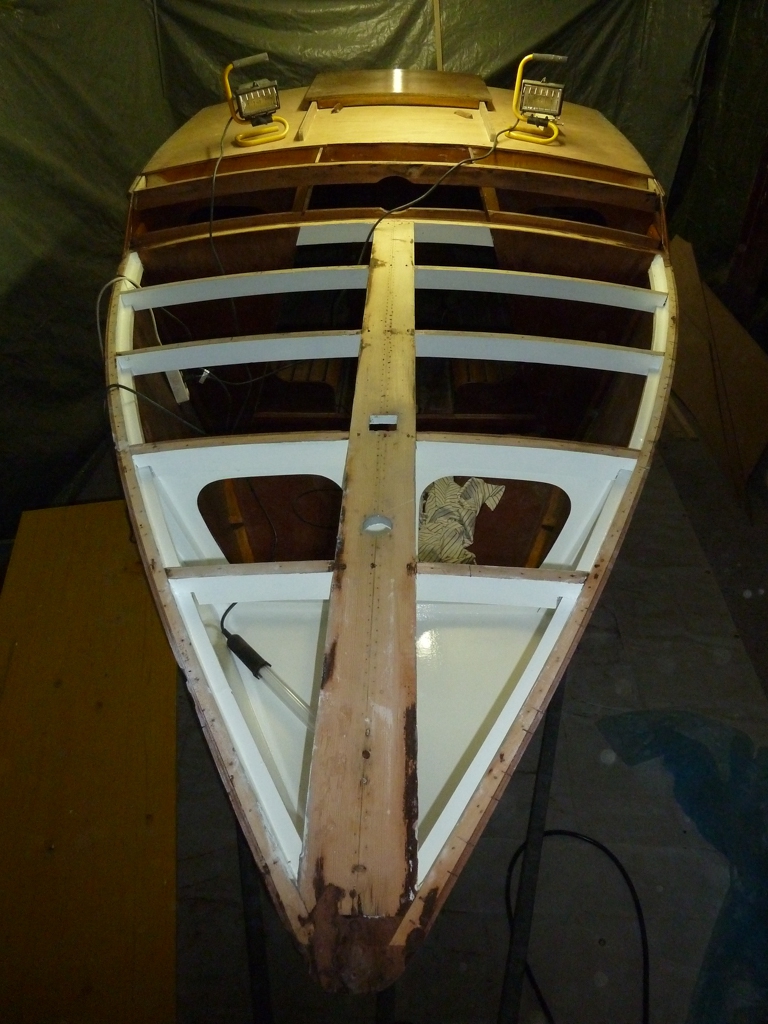 Voila, le roof est poncé, j'ai coupé une bande entre les deux premiers barrots, les hiloires latérales n'ont pas souffert des prises d'eau, mais l'hiloire avant semble avoir vécu une autre vie ! Ce qui lors de l'inspection avant l'achat semblait être un problème d'étanchéité du hublot est en fait une prolongation du problème du pied de mât !