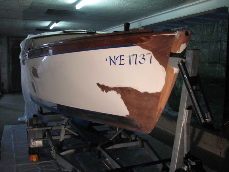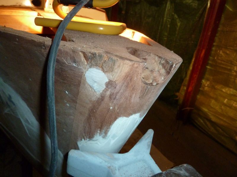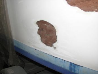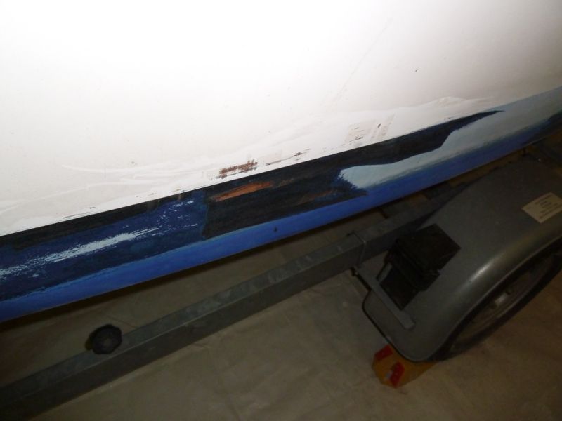 Pas de photos prises avant d'attaquer à l'appui (voir première photo ci-dessous prise après un coup de grattoir), mais lors de la visite j'avais bien vu quelques friselis sur la coque, j'ai pensé que ponçage à fond des zones humides suffirait.