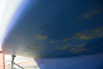 Bateau sorti, de larges plaques d'antifouling se détachent et laissent entrevoir que le bateau a été initialement peint avec un antifouling bronze. Un antifouling à matrice dure a été remis dessus et se détache. Par endroits on a poncé et tenté de consolider un peu, ce sont des zones plus dures à poncer.