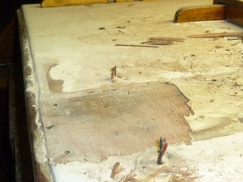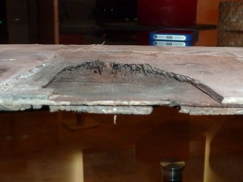 Tracé et coupé, à mi élongis mais à ras du barrot on verra plus tard s'il faut défoncer. J'ai ramené le morceau à la maison en souvenir. Le vernis ça tient quand même bien les choses en place, mais au ponçage ça se serait enfoncé.