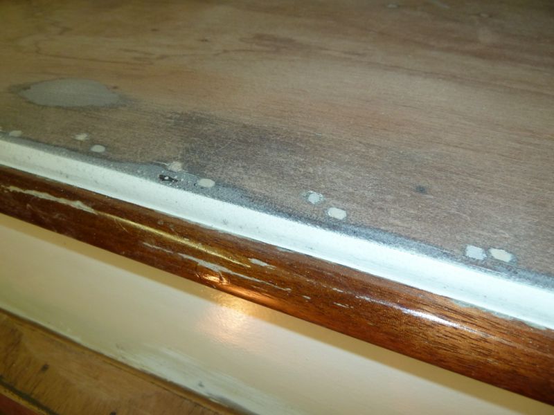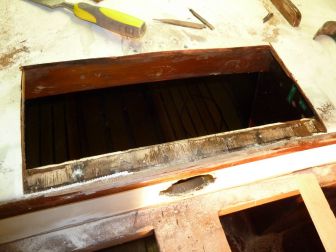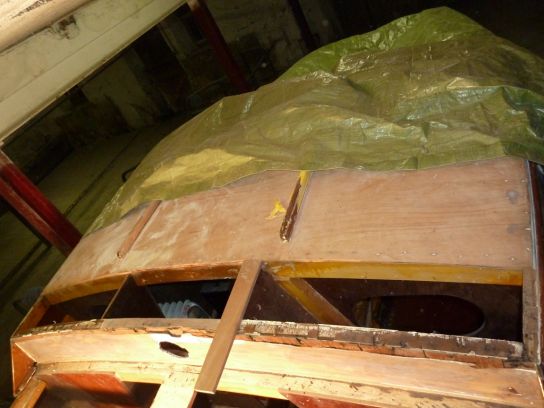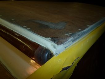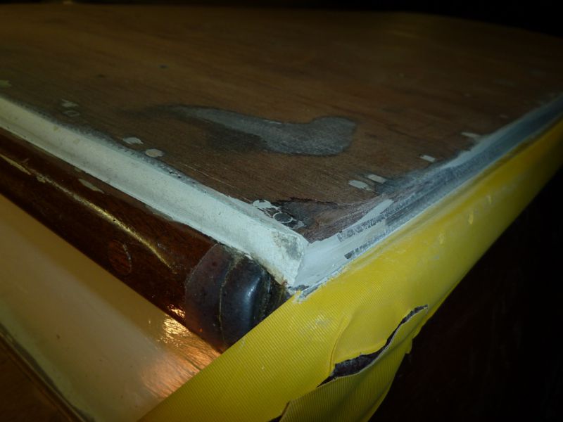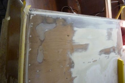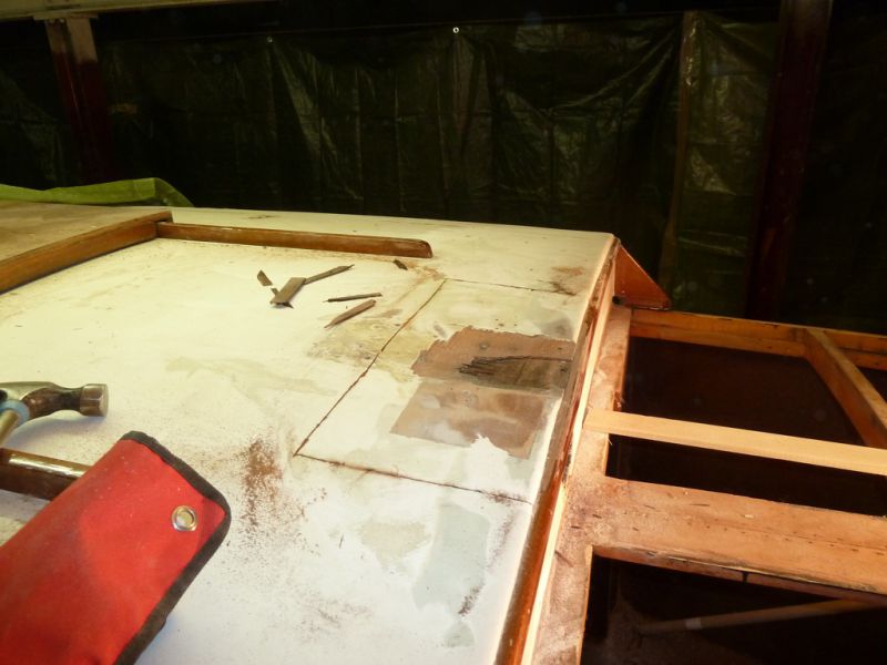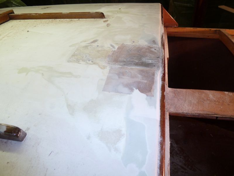 Je continue de poncer sur zone, on revit l'histoire du bateau. Les enduits deux composants et la stratification avec tissu c'est dur à poncer! Vive la ponceuse à bande mais attention, de travers et c'est un sillon ou une vague. Hum les coins du roof sont bien protégés et voyons voir ce qu'il y a là-dessous ..